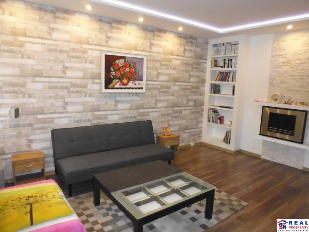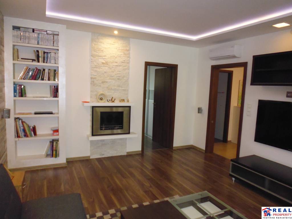 - veľká obývacia izba s klimatizačnou jednotkou: posuvné dvere, obývacia zostava, televízor, sedačka, konferenčný stôl, krb s obkladom /kremeň/, zasklená loggia /V/