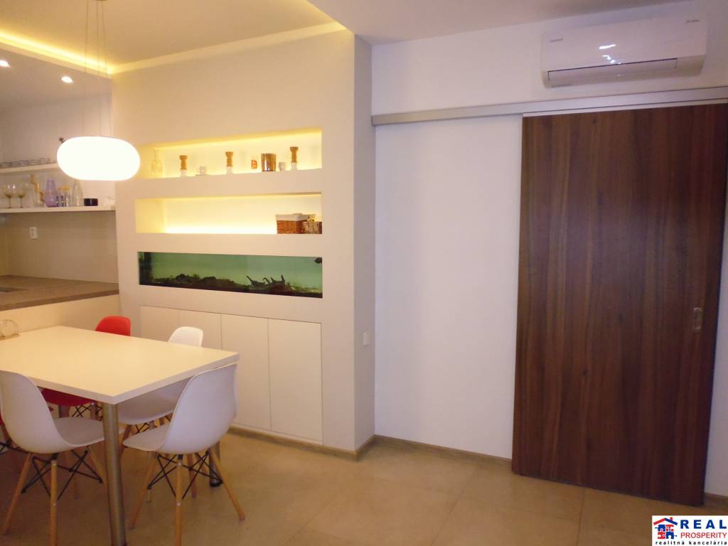 - jedáleň s klimatizačnou jednotkou: jedálenský stôl so stoličkami, pult a skrinky na mieru, akvárium s podsvietením /V/